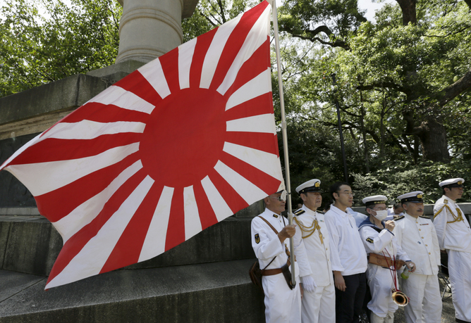 ” Japanese people wearing imperial navy costumes raise a rising sun flag as they visit the controversial Yasukuni Shrine to mourn for victims of World War Two in front of a torii gate at the shrine, Japan, 15 August 2014, marking the 69th anniversary of the end of World War Two. More than 2.5 million Japanese soldiers who died in the service are enshrined at Yasukuni, including convicted war criminals from World War II.” EPA/KIMIMASA MAYAMA